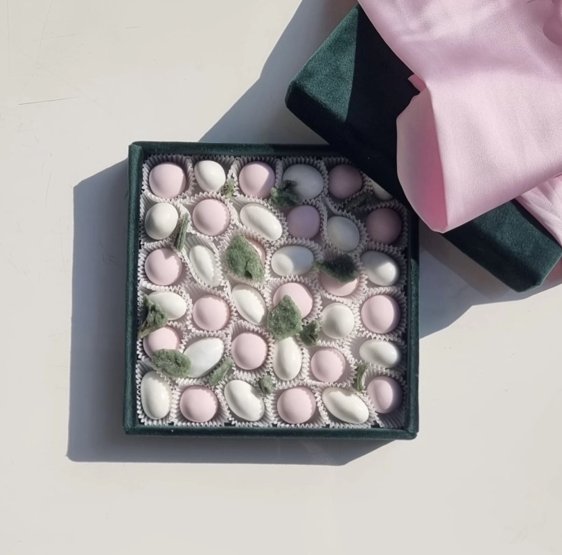 Scopri l'eleganza della nostra **scatola in velluto verde**, misura 15x15 cm, perfetta per celebrare occasioni speciali. All'interno, troverai una deliziosa selezione di confetti con mandorla avvolti in cioccolato aromatizzato, completamente senza glutine. Per un tocco unico, aggiungiamo petali di menta cristallizzati e cereali rosa lavorati con cioccolato al latte. Ogni scatola è finemente rifinita con una fusciacca di seta pura rosa, che aggiunge raffinatezza e un tocco di colore. Perfetta per chi cerca un regalo ricercato o un dettaglio memorabile per eventi speciali, combinando gusto e stile in ogni dettaglio.