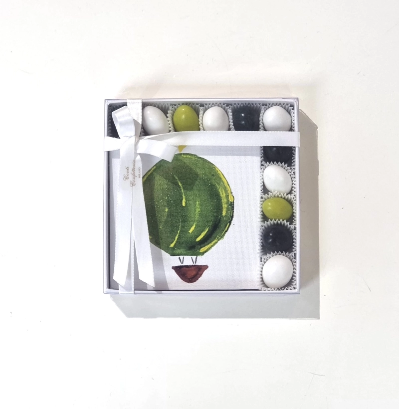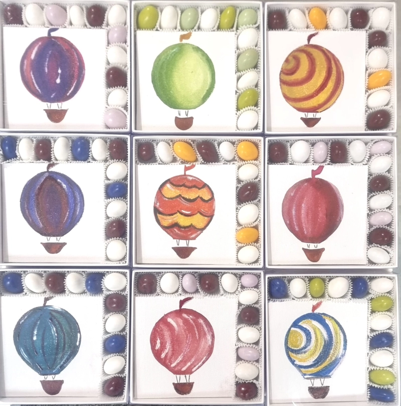 Magnifiques tableaux de motifs mixtes de montgolfières réalisés entièrement à la main, enfermés dans des boîtes de 13 x 13 cm contenant des dragées aux amandes et au chocolat parfumées aux fruits et crèmes sans gluten nouées par un nœud en satin de soie