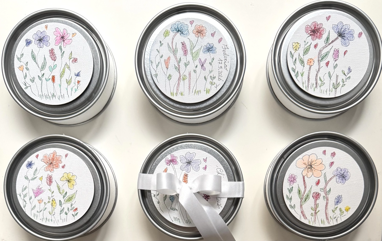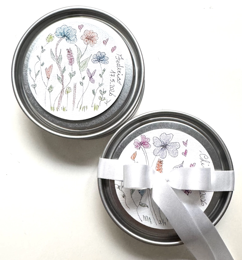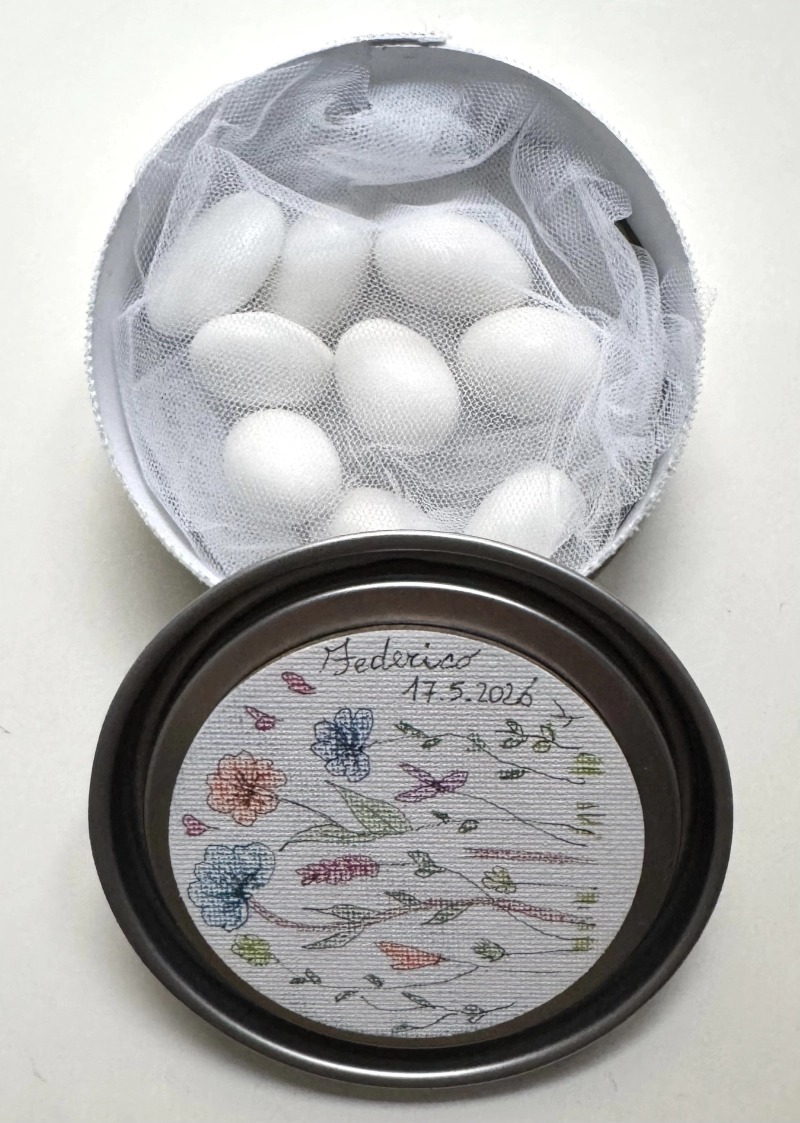 Barattolo rivestito in lino bianco diametro cm 10 alt cm 3 contenente 9 confetti con mandorla e cioccolato aromatizzato. Sul coperchio magnete dipinto a mano con nome e data evento. Fiocco in raso di seta. Confetti gluten free
