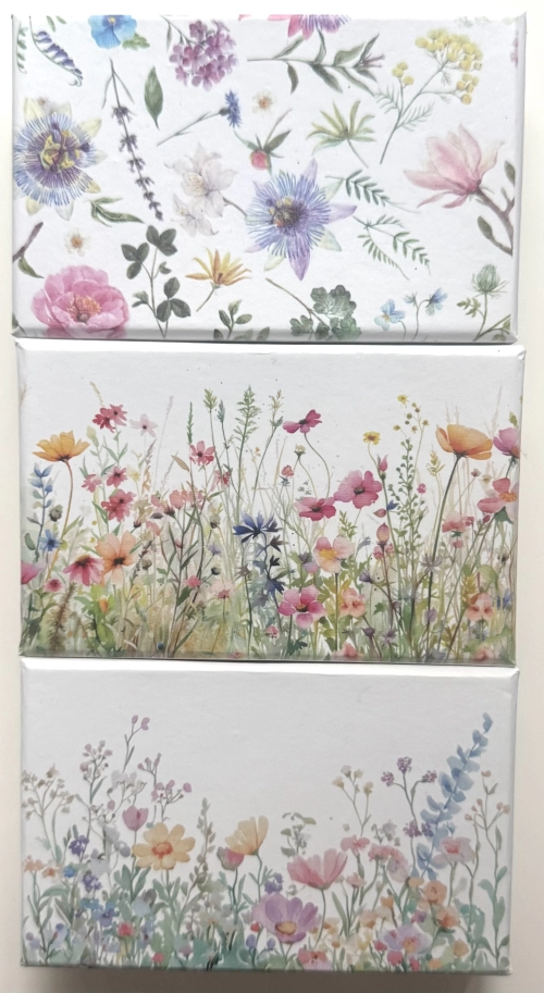 Deliziosa scatolina con fantasie floreali miste , cm 11 per cm 7 contenente 9 confetti (gluten free)di cui 3 dipinti a mano e chiuse con nastro in organza di seta