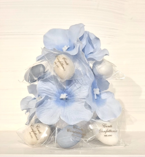 Composizione di 13 confetti bianchi e azzurri con mandorla e cioccolato aromatizzato (gluten free) incartati singolarmente e petali di ortensia in tessuto ,alt cm 11 , chiusa in una shopper in pvc trasparente