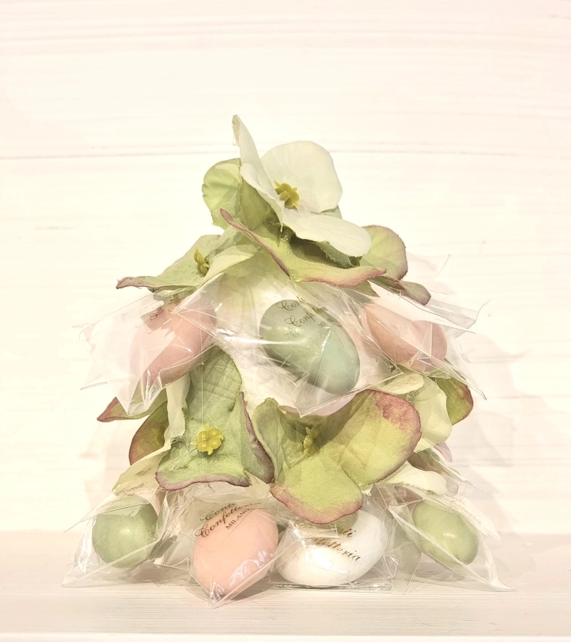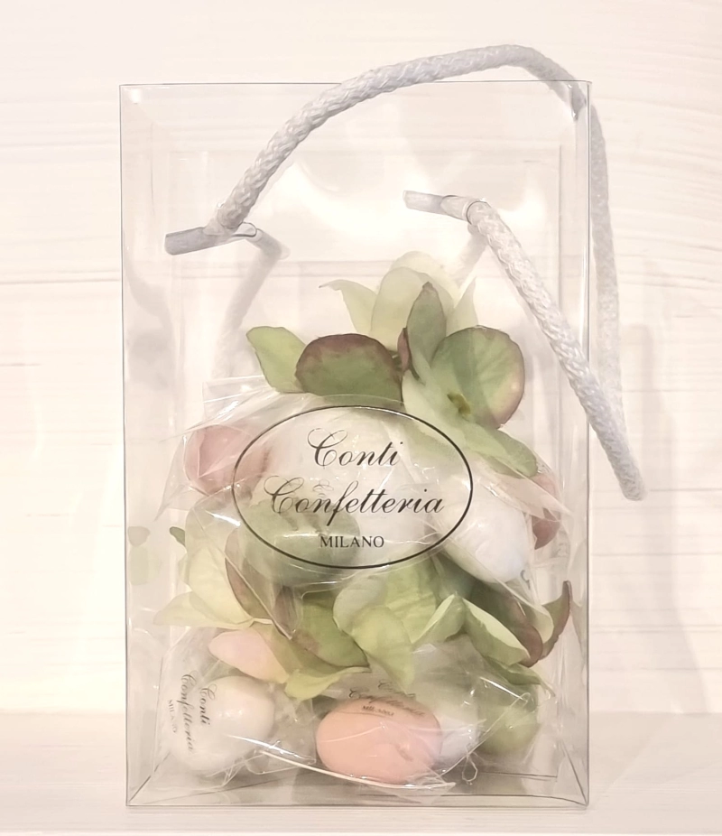 Composizione di 13 confetti bianchi , verdi e rosa con mandorla e cioccolato aromatizzato (gluten free) incartati singolarmente e petali di ortensia in tessuto ,alt cm 11 , chiusa in una shopper in pvc trasparente