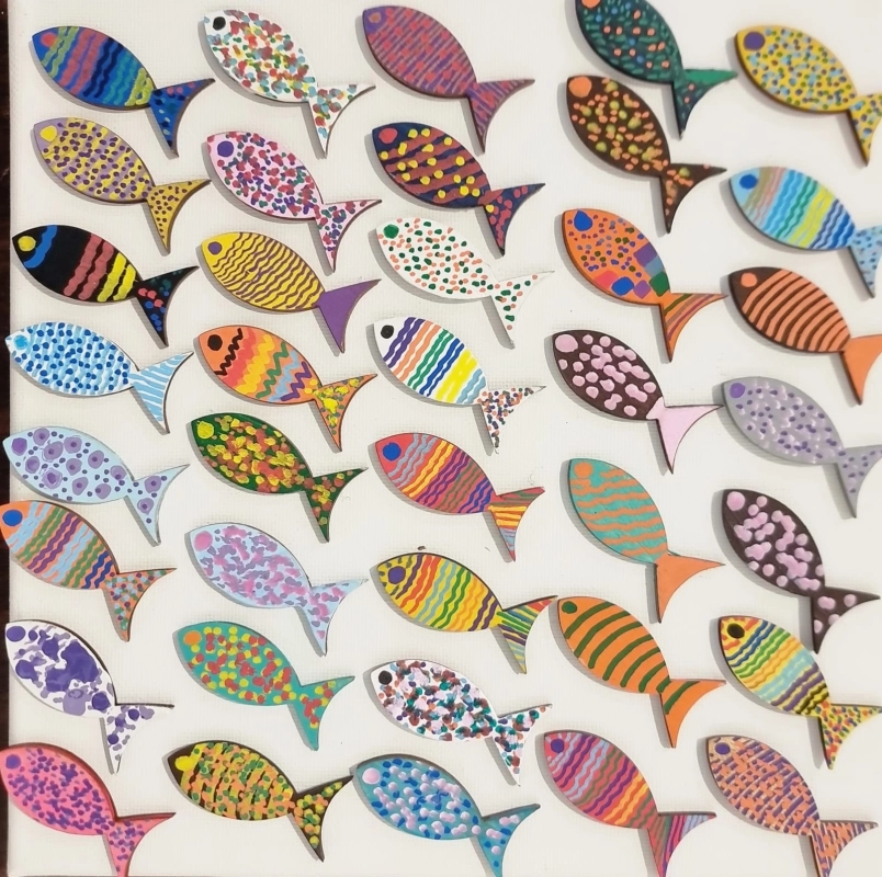 Delizioso set di 9 cubini in pvc 3x3x3 con all interno 3 confetti di mandorla e cioccolato aromatizzato (gluten free ) nei colori del pesciolino in legno decorato a mano fantasie miste
