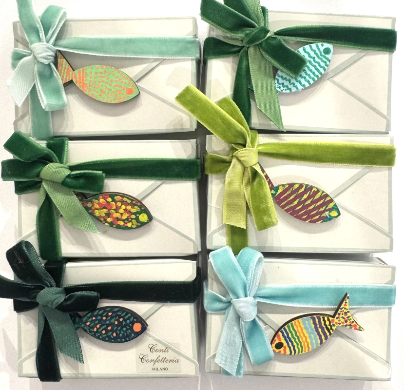 Chiusura con pesciolino in legno dipinto a mano fantasie miste e fiocco in velluto