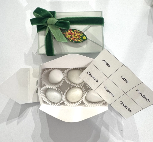 Deliziosa scatolina nei toni del verde con all interno 6 confetti di gusti differenti con mandorla e cioccolato aromatizzato alle creme (gluten free) misura cm 8x6.