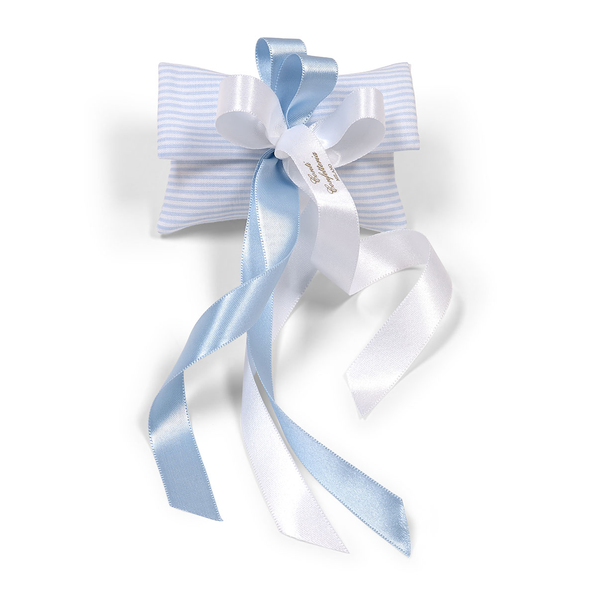 Pochette mini in cotone rigato bianco e azzurro chiusa da doppio nastro in doppio raso bianco e azzurro.