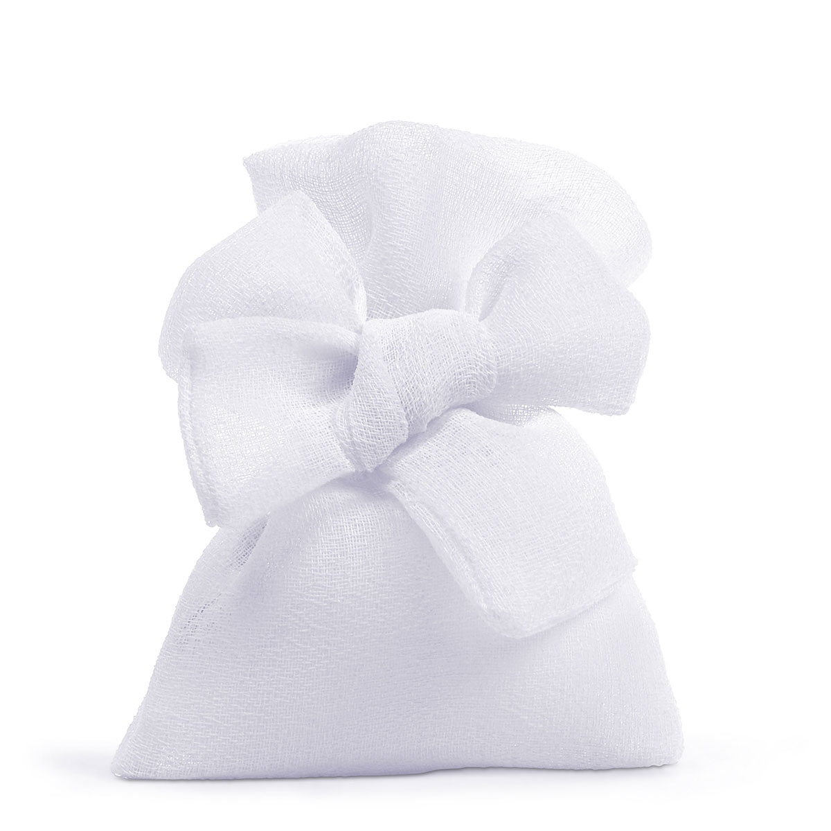 Morbido sacchetto in garza di lino, linee classiche, fondo piatto, chiuso da fusciacca ton sur ton