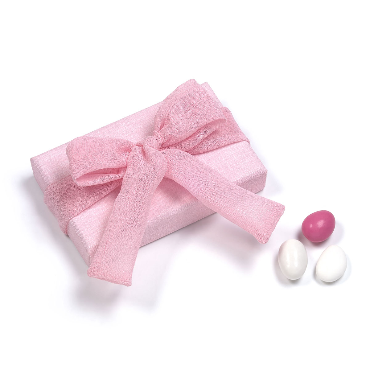 Scatola rettangolare rivestita di garza di lino, chiusa da fusciacca ton sur ton. I 18 confetti all’interno sono disposti singolarmente dentro al loro pirottino: due file di confetti di finissima mandorla glassati e la fila centrale composta di confetti di mandorla finissima ricoperta di cioccolato al latte disponibile nei colori bianco o rosa