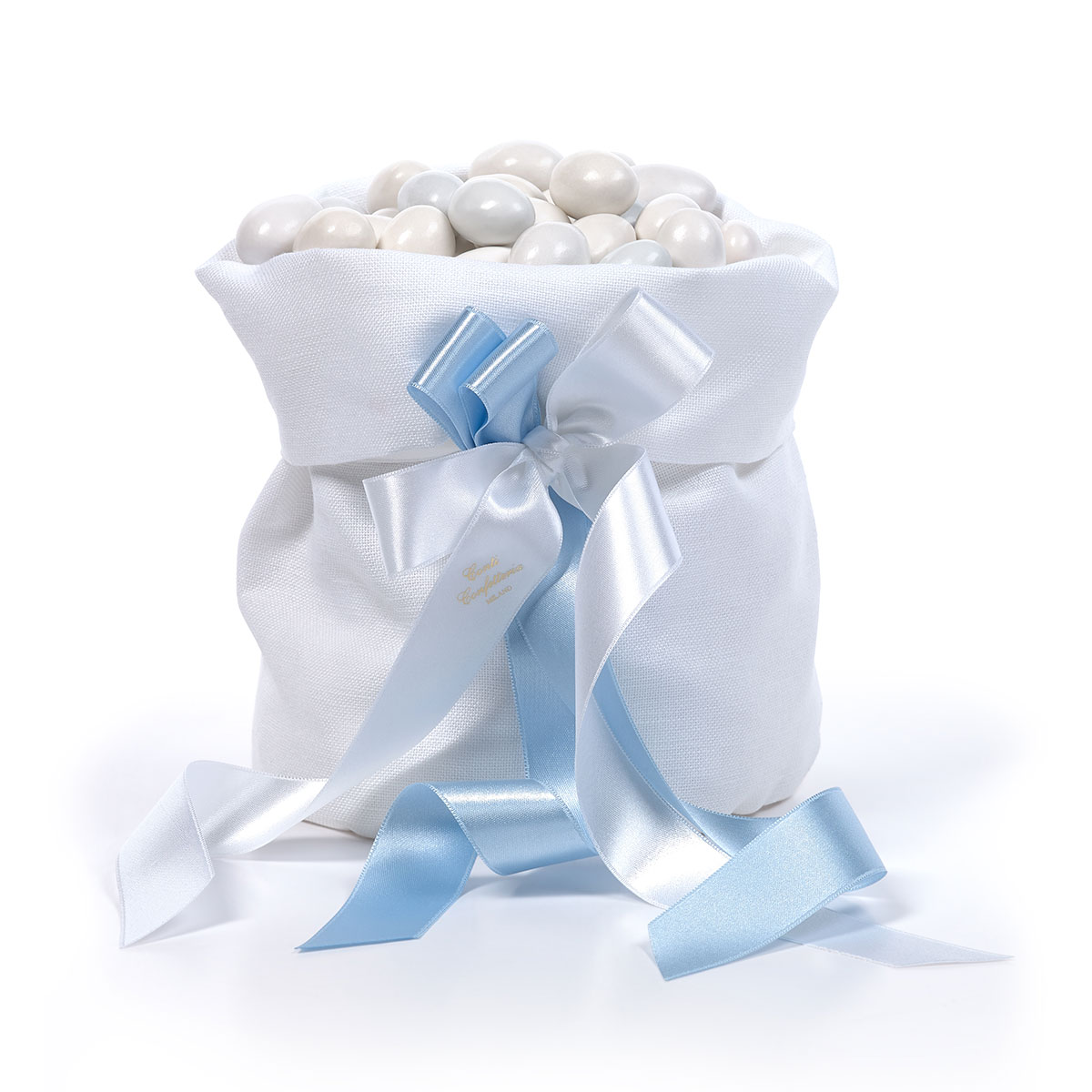 Morbido sacchetto in lino bianco; con risvolto, decorato da fiocco in doppio raso. E’ il modo più elegante e delicato di offrire i confetti ai colleghi in ufficio o agli ospiti a casa. Intramontabile classicità anche per le confettate. Perfetto per contenere 1 kg di confetti