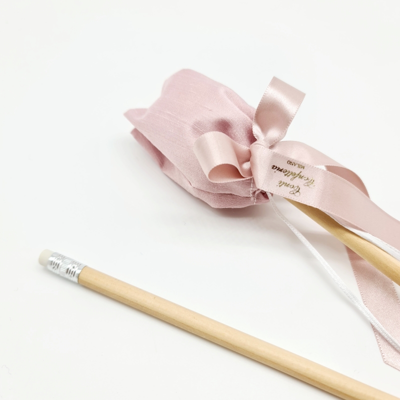 Sacchetto a tulipano in shantung di seta contenente 5 confetti di mandorla con cioccolato aromatizzato ai gusti frutta e creme. Matita in legno