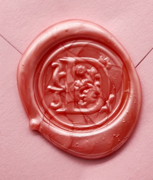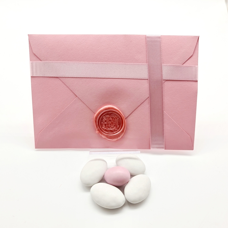 Busta con confetti, nastro in seta e chiusura con sigillo in ceralacca personalizzato nei toni del rosa