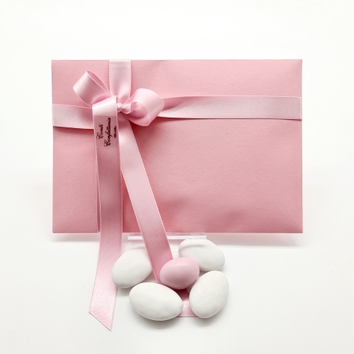 Busta misura cm 16x12 contenente 4 confetti al cioccolato fondente e bianco e 1 confetto rosa con mandorla e cioccolato al latte. Fiocco in raso di seta. Chiusura con sigillo in ceralacca personalizzabile