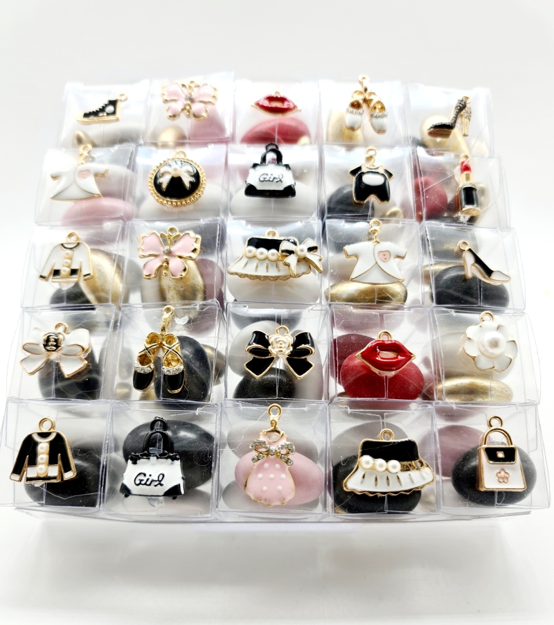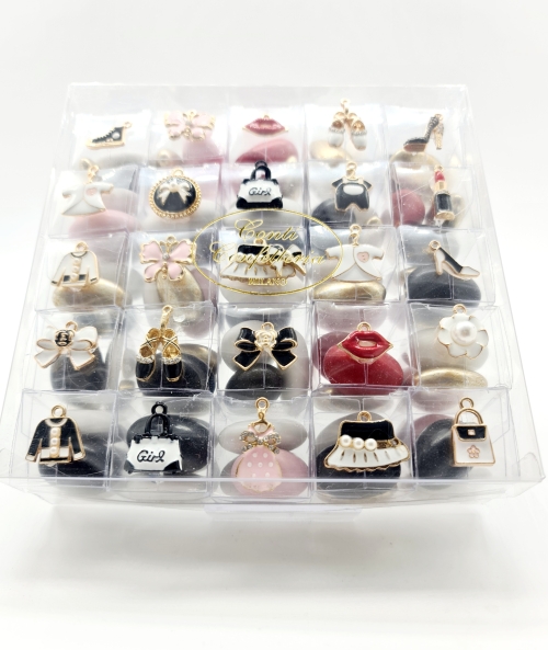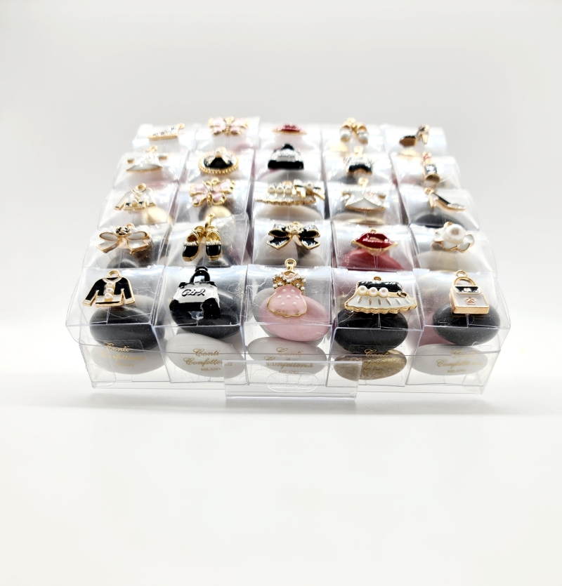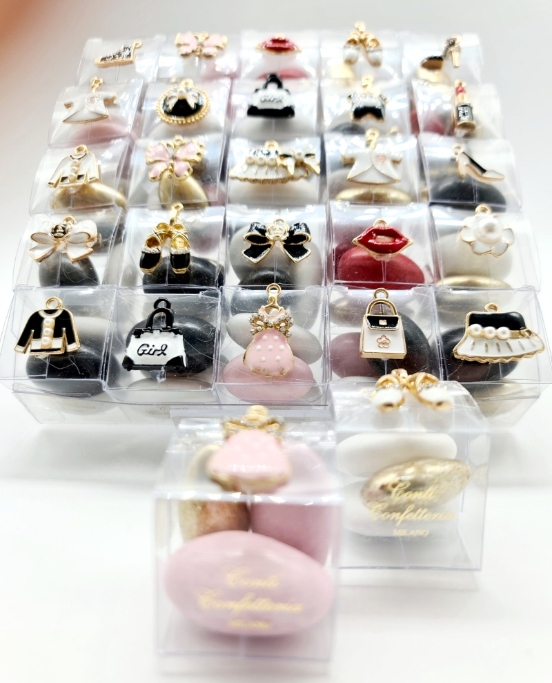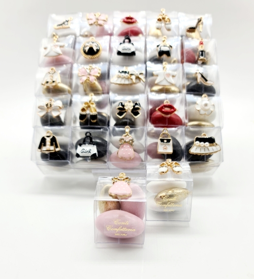 Scatola in pvc misura cm 15x15 contenente 25 cubini in pvc misura cm 3x3x3 con all interno tre confetti con mandorla e cioccolato aromatizzato ai gusti frutta e creme. Applicazione di ciondoli in acciaio smaltato