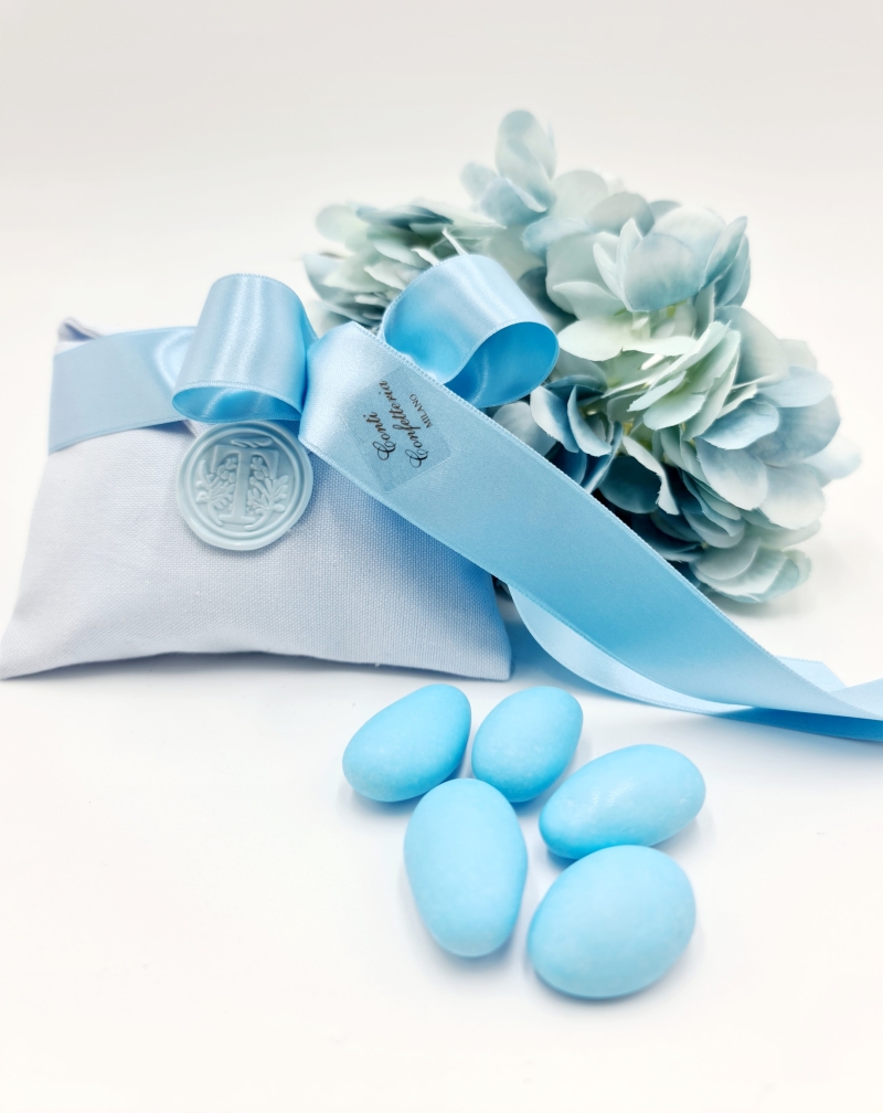 Busta in lino azzurro misura larghezza cm 12 altezza cm 10 contenente sette confetti di finissima mandorla ( gluten free)
