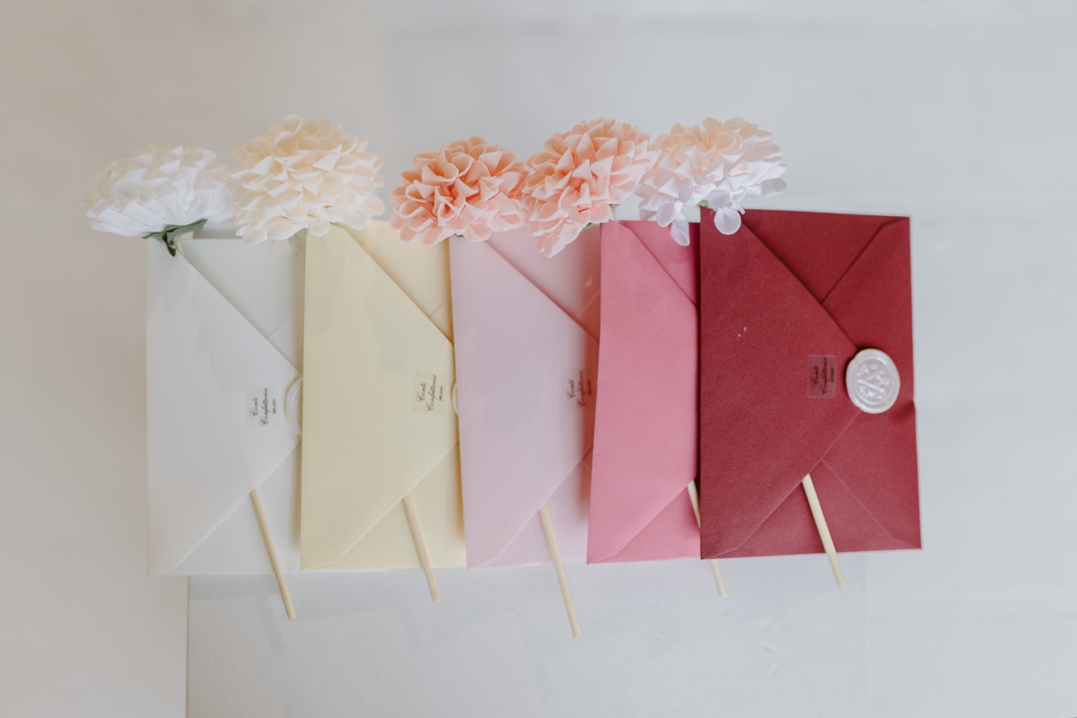 Buste in carta rosso rubino con sigillo in ceralacca e fiore in tessuto