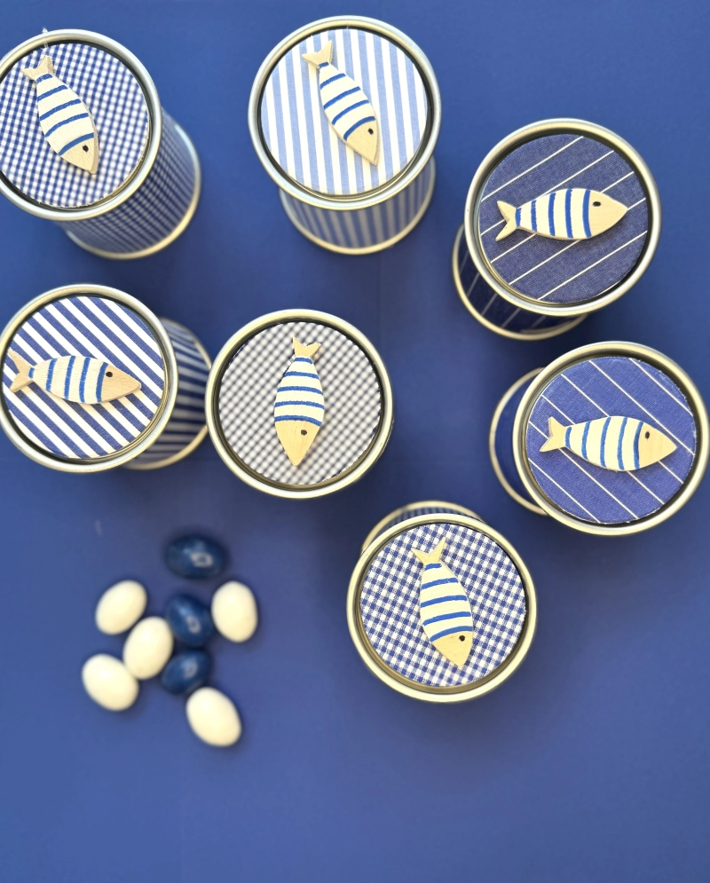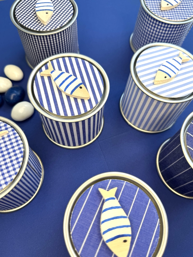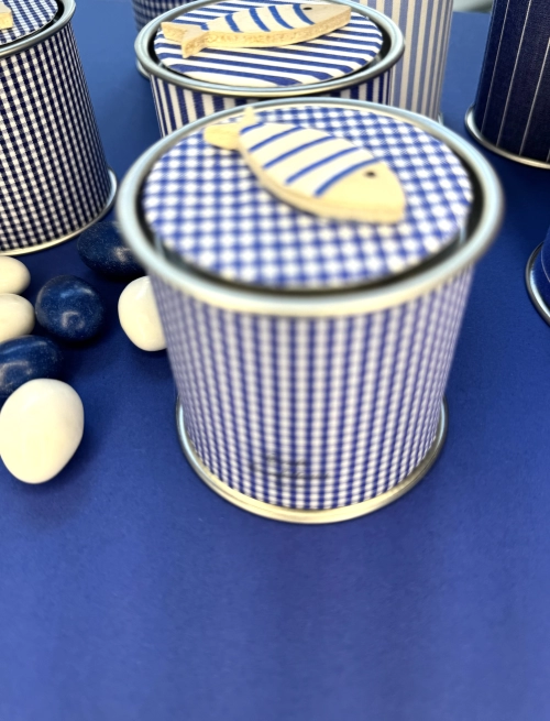 Βαζάκια καλυμμένα από βαμβάκι με καθαρό μπλε μοτίβο μείγμα με ξύλινη διακόσμηση ψαριού, που περιέχει 100 g κουφέτα αμύγδαλου και σοκολάτας αρωματισμένα με γεύσεις φρούτων και κρέμες χωρίς γλουτένη. Αυτά τα κομψά βαζάκια είναι ιδανικά ως μπομπονιέρες για ειδικές εκδηλώσεις όπως βαπτίσεις, επιβεβαιώσεις και γάμους. Χαρίστε μια γλυκιά και εκλεπτυσμένη στιγμή στους καλεσμένους σας με αυτά τα υψηλής ποιότητας κομφετί με ακαταμάχητη γεύση. Έκπληξη και απόλαυση με τα βαζάκια Conti Confeteria!